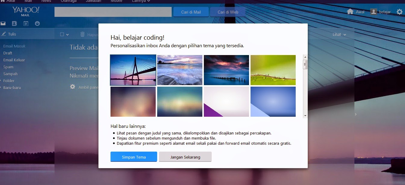 6. Selanjunya Halaman home email anda akan muncul , pilih tema untuk halaman email anda lalu klik simpan sekarang